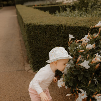 Her tiny hand hovered in the air for balance as she steadied herself beside a pot of flowers. Instead of rushing past, she leaned in to smell them — a moment so pure and instinctive it felt almost scripted by nature itself. Barefoot on the warm path, she was fully present. Exploring not just her surroundings, but her own growing independence.